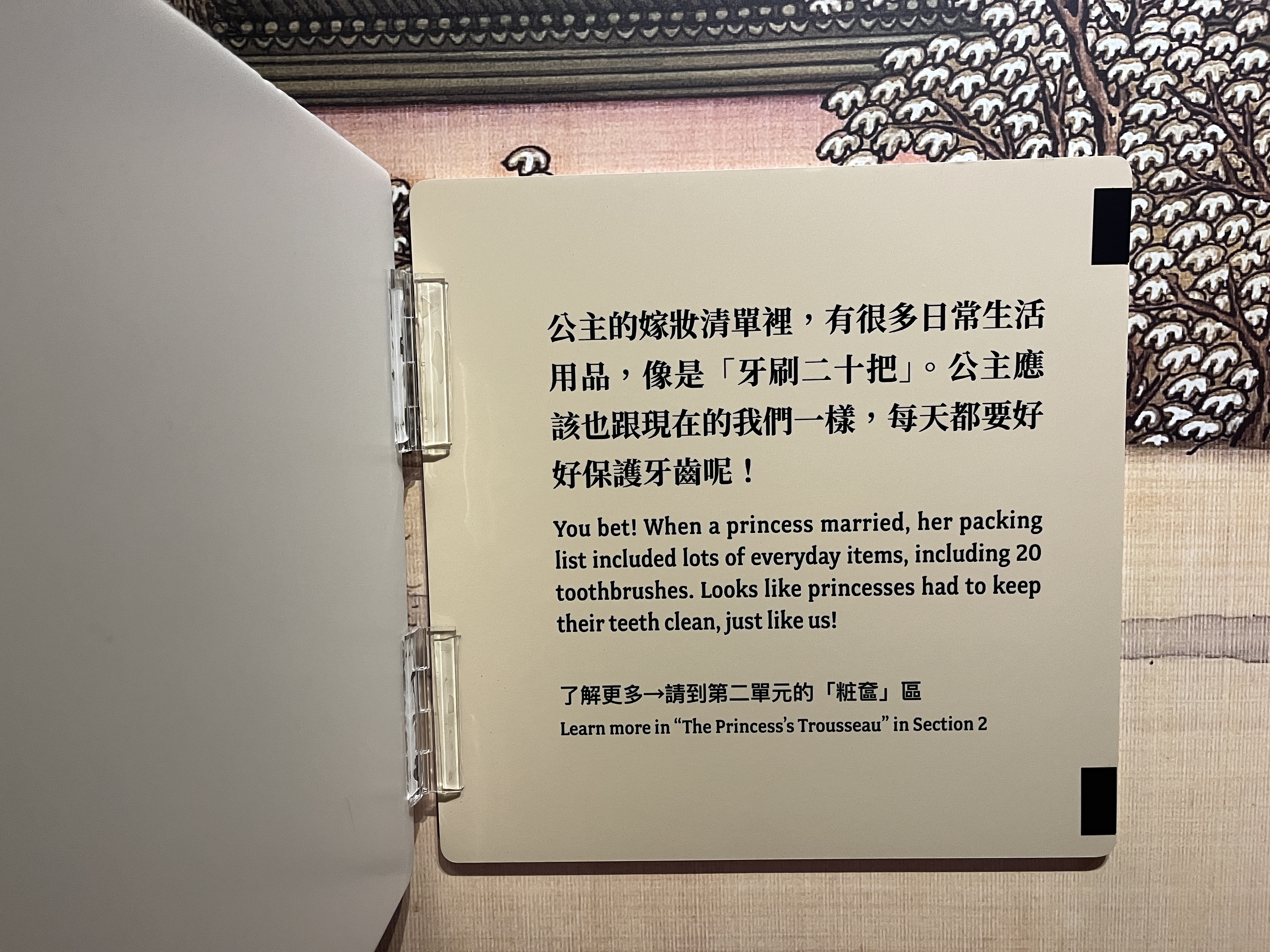 (정답 3). 청나라 공주들이 시집을 갈 때 챙겼던 목록을 보면 '칫솔 20개'도 포함됐다고 합니다. 공주의 일상을 알 수 있는 자료이기는 한데, 어린아이들이 많이 올 것으로 예상하고 아이들의 흥미를 유발해 자발적인 양치습관을 배양하기 위한 전시기획자의 의도가 조금 보이는 대목입니다.