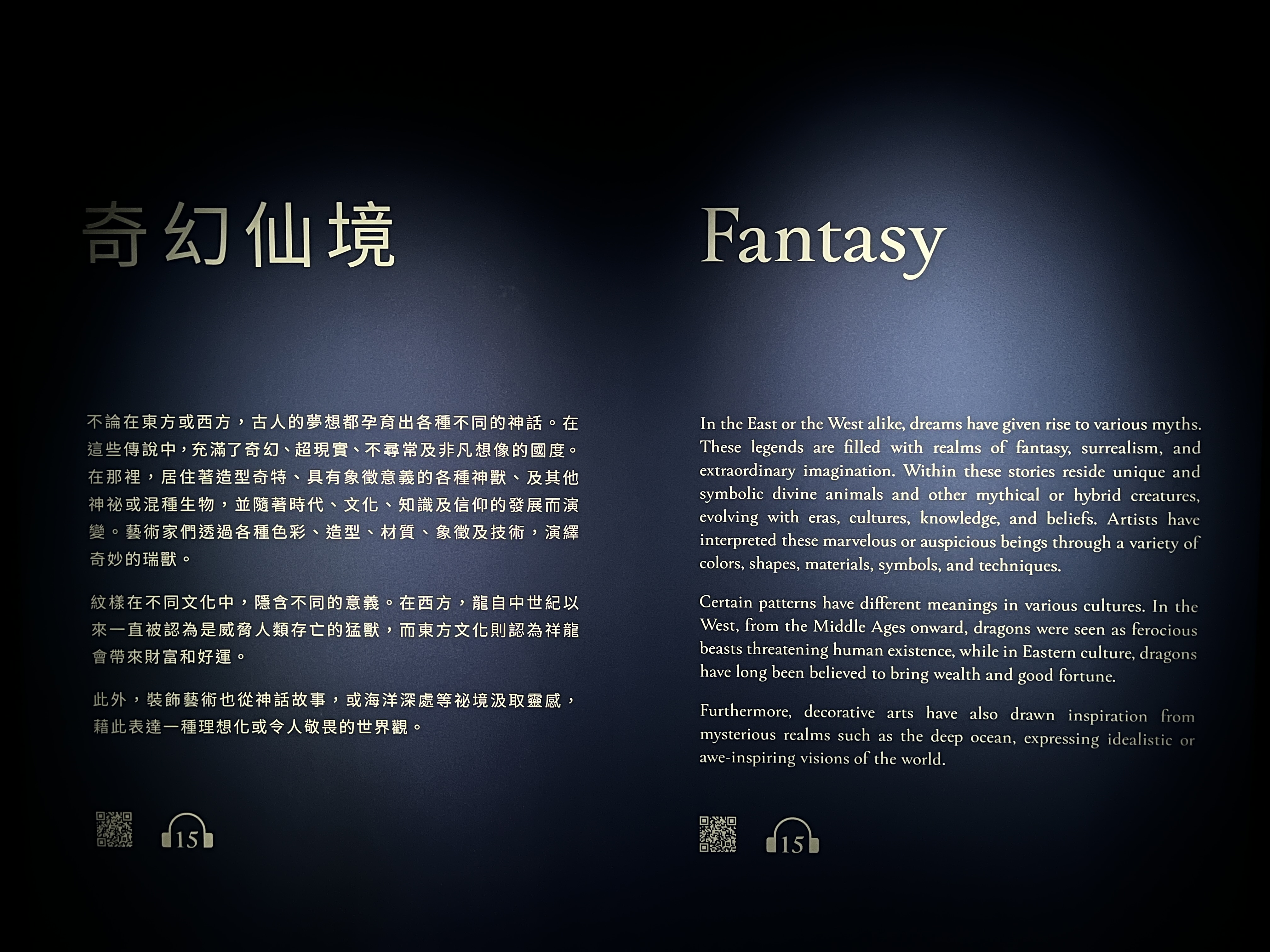 기환선경을 제일 잘 표현하는 영단어는 '판타지'입니다. 동서고금을 막론하고 인간의 상상력은 다양한 전설 속 동물과 신화를 탄생시켰는데요. 이러한 초현실적인 세계에서 존재하는 동물들의 비범한 능력이나 인간의 상상 속에서 존재하는 희귀한 생물들의 특징들을 기호화시켜 다양한 색상과 모양, 재료들에 녹여내는 겁니다. 특히 4번 전시공간에서 도움이 되는 요소는 '길상문양 吉祥紋樣'인데요. 상징성으로 가득 찬 작품들 속에 숨겨진 신화 속 이야기나 신비한 장소에 대한 경외감등을 찾아보세요.