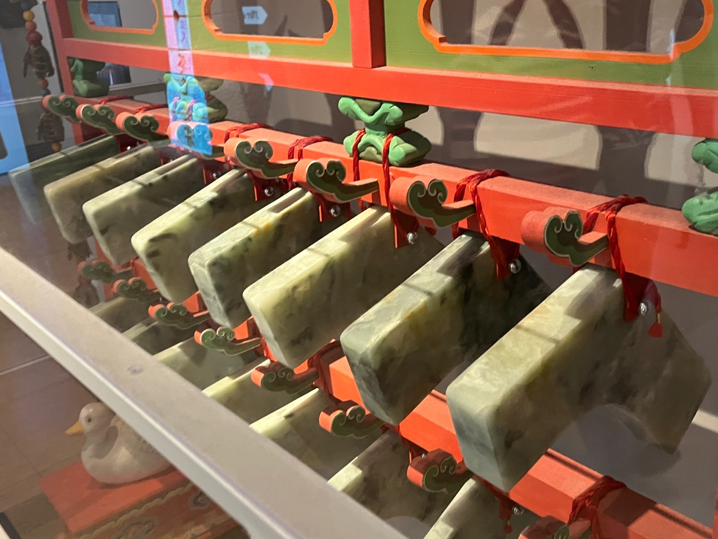 그런데 이 편경 조각을 보고 있으면 다소 심심하다는 생각이 드는 이유가 있습니다. 우선 보시다시피 편경 재료인 돌의 색깔이 탁합니다. 전국시대의 것(기원전 약 3세기)이라고 하니 지난 세월의 무게가 스며든 것일까요? 하지만 좋은 옥은 시간이 지나도 그 빛이 변하지 않습니다. '문묘악기도설'에 그려진 편경의 모습(18세기)을 봐도 구조물들이 화려하다기보다는 단순한 편에 가깝습니다. 왕실에서 사용된 악기들은 소리 뿐 아니라 그 외형에서도 왕실의 권위를 드러내기 마련인데 말이죠. 한편 조선의 편경은 이렇게 생겼습니다.