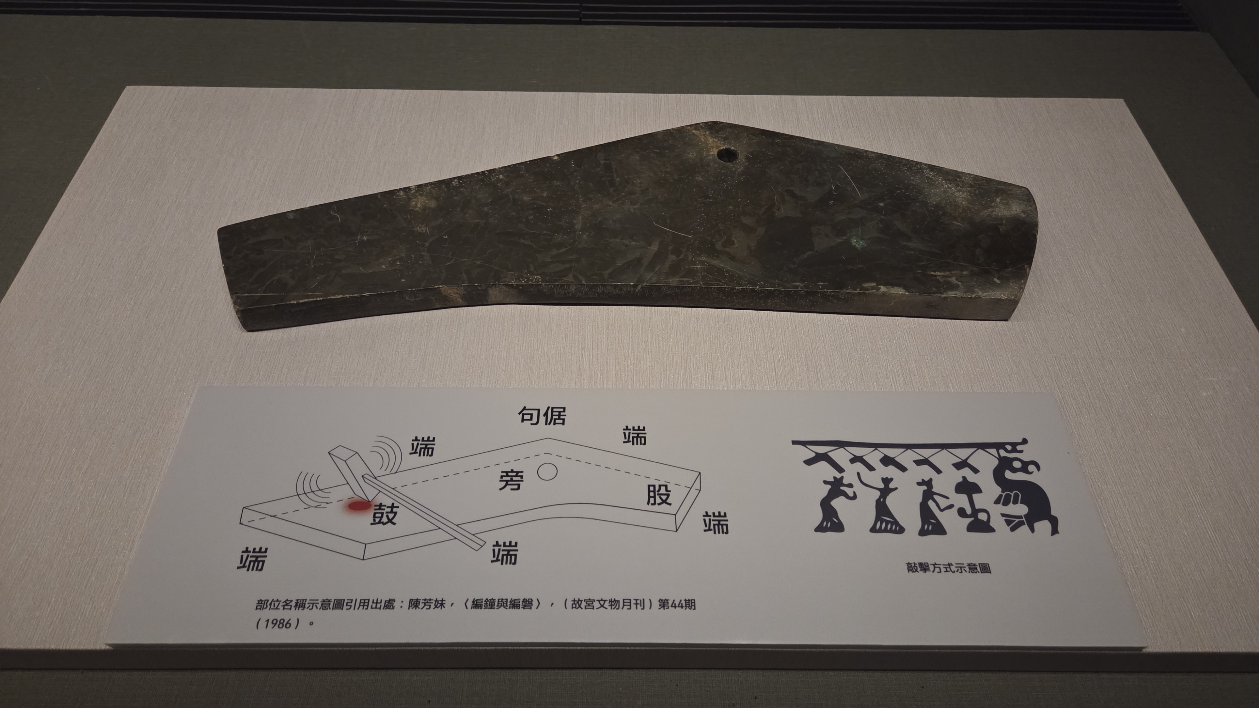 편종과 편경은 온도와 습도의 영향을 받지 않아, 다른 악기들의 음을 잡아주는 표준음 역할을 하는 악기였는데요. 이 편경을 이루는 단 한 점이 이번 전시에 나왔는데, 사진 보시겠습니다.