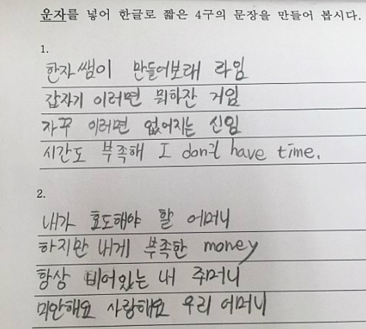 이해를 돕기 위해 초등학생이 작성했다는 압운법 시를 보여드리죠. 아래 1번의 예시는 '11언 절구' 형식의 한시韓詩라고 하겠습니다. 🤣