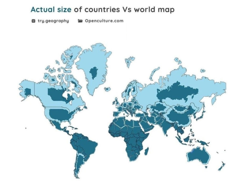 '지도는 권력이다.' 이 명제를 여실히 보여주고 있는 게 바로 현재의 세계지도입니다. 세계지도를 보면 서구중심의 세계질서를 볼 수 있는데요. 메르카토르 도법에 의해 북반구에 있는 나라들, 특히 세계대전 이후 패권을 잡은 강대국들의 영토가 비정상적으로 확대된 채 지도에 투영돼 있습니다. 이를 실제 크기와 비교를 해보면 다음과 같습니다.