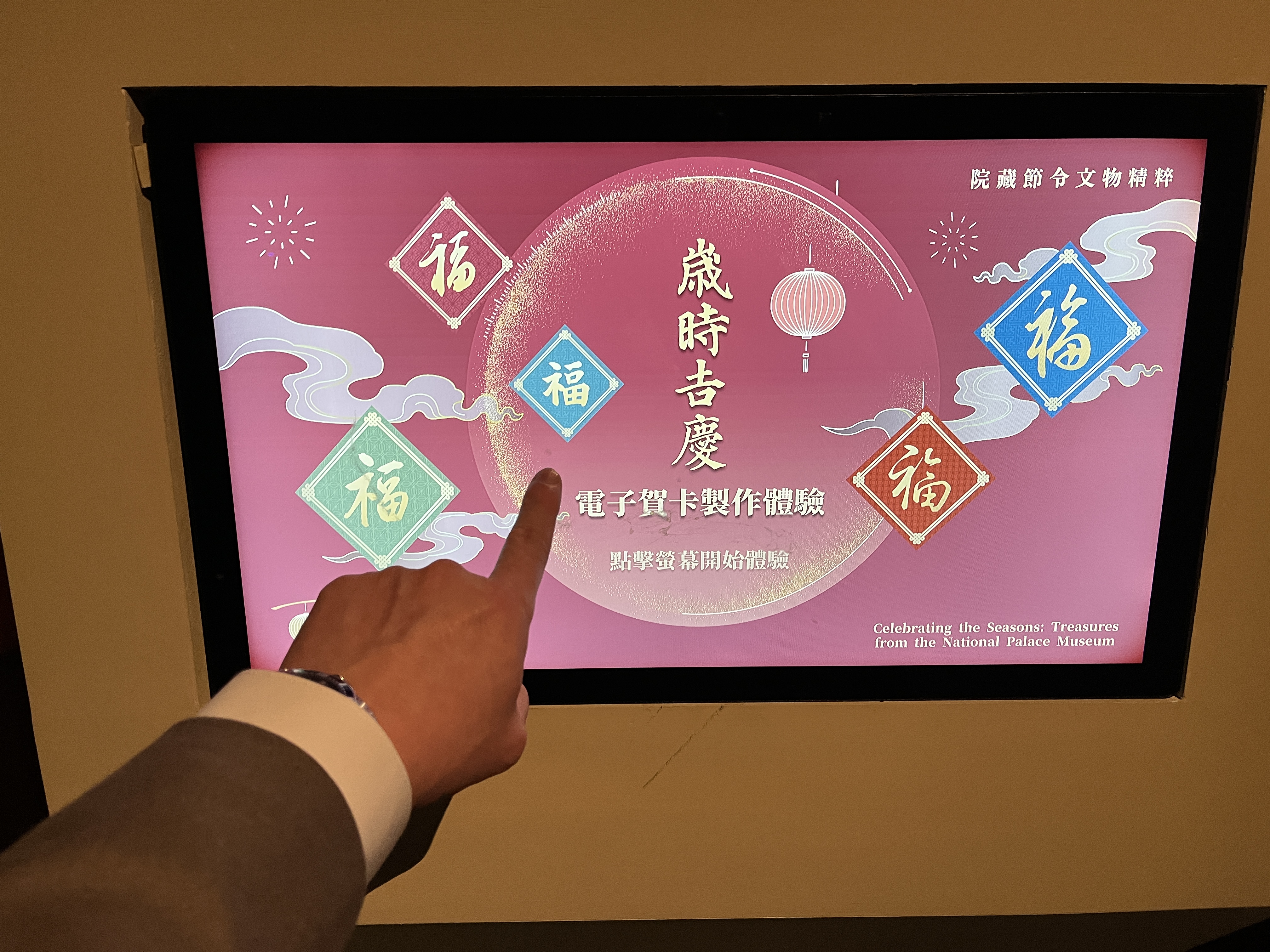 : 107호를 빠져나가기 전, 직접 체험해 볼 수 있는 설비가 있습니다. 춘련(春聯)이라 불리는 종이의 색생과 배경무늬, 서체를 '강희/옹정/건륭/가경/성풍제'의 필체 중 하나를 선택해 '복福' 자를 받을 수 있습니다.