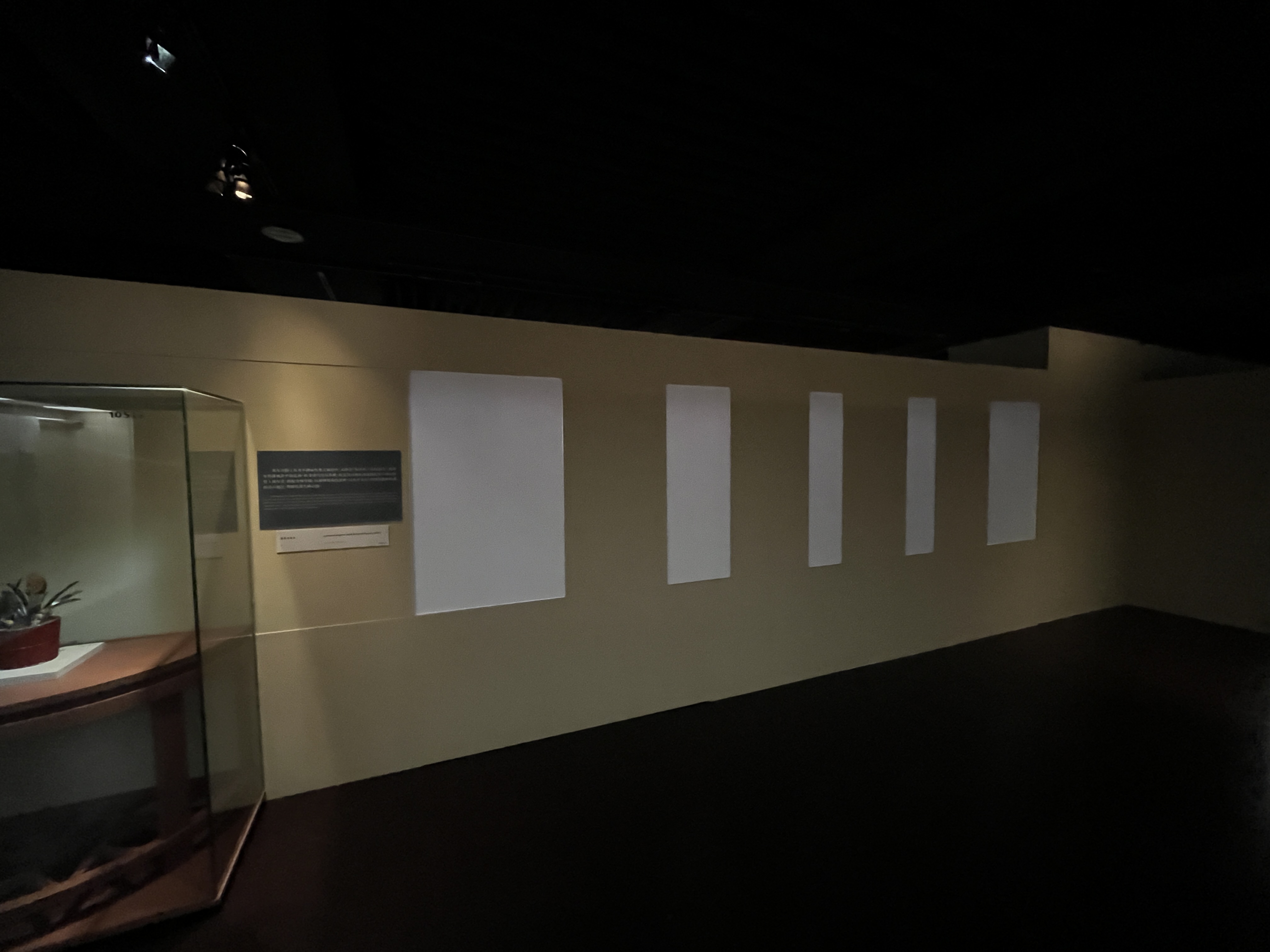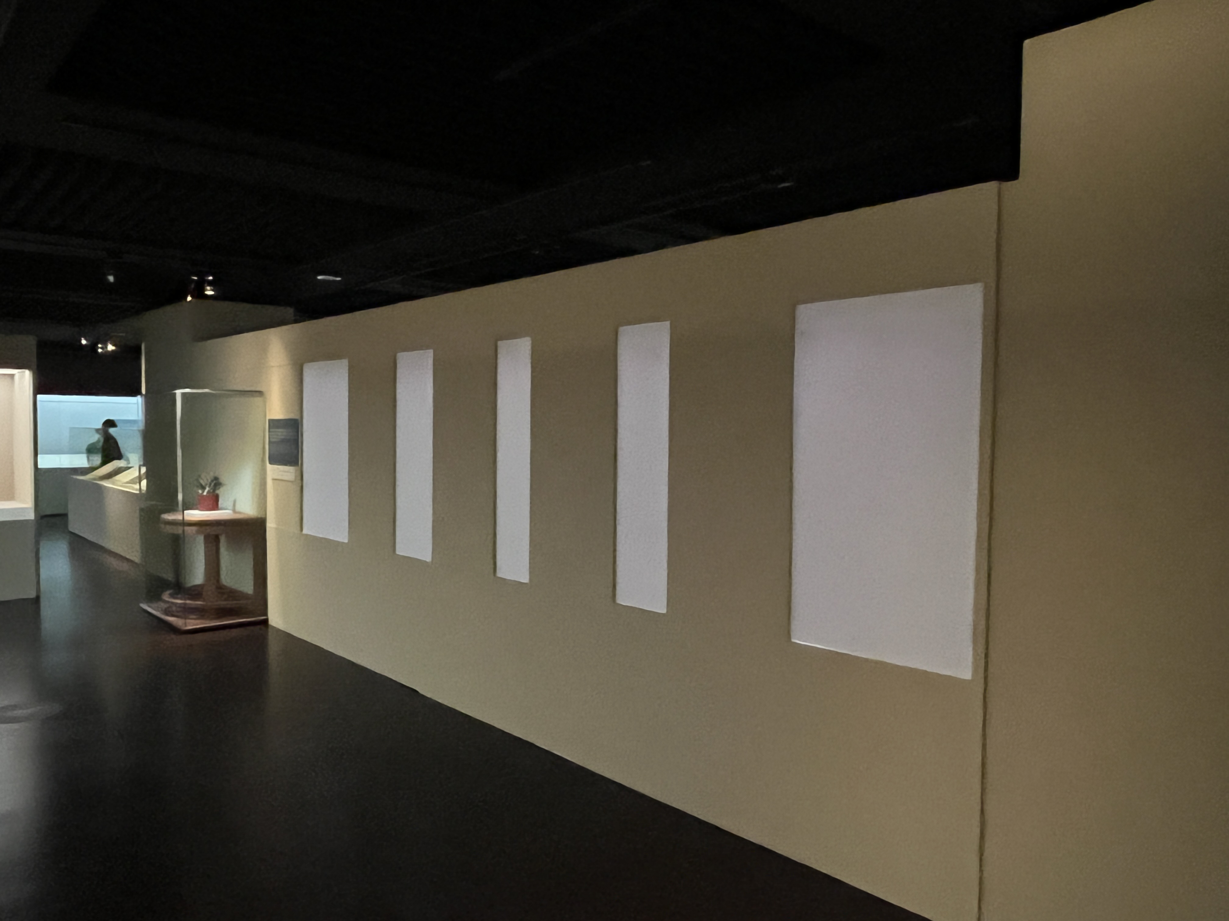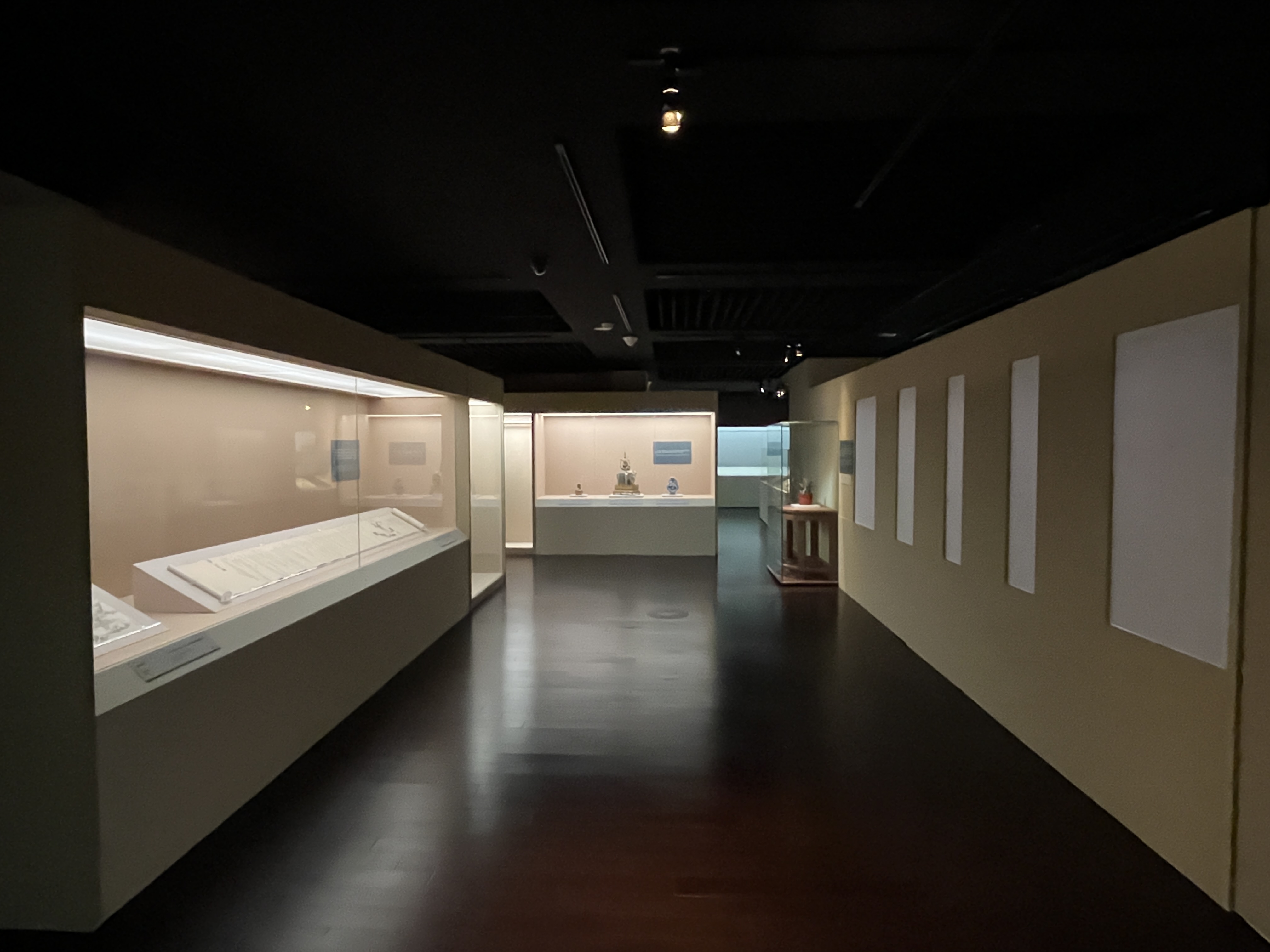 전혀 바뀐 곳이 없었습니다! 심지어 미리 개시했던 때보다도 조명이 더 어두워지기까지 했더군요. 누가 봐도 전시 벽인데, 저기를 저렇게 휑하게 둔 점, 정말 그냥 지나는 벽에 지나지 않았다면 마감처리를 하지 않은 점, 올 해가 고궁 100주년이라 관람객들의 기대가 큰 시점인데 저 넓은 공간에 문물을 하나라도 더 배치했다면 어땠을까 하는 아쉬움, 그리고 이전 전시 때의 실내 구성과 너무나도 확연히 차이나는 몰입감 등 아쉬운 구석이 많은 전시였습니다. 참고로 저 자리가 대미불언 전시 때는 아래와 같은 공간으로 구성돼 있었습니다. 전혀 다른 박물관 같이 느껴지지 않나요?