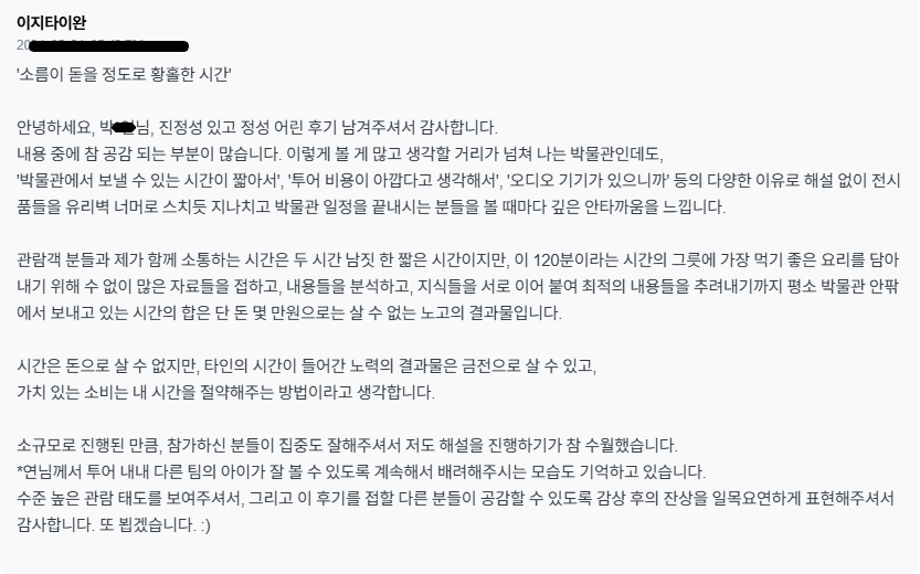 시간은 돈으로 살 수 없지만, 타인의 시간이 들어간 노력의 결과물은 금전으로 살 수 있고, 가치 있는 소비는 내 시간을 절약해주는 방법이라고 생각합니다. 소규모로 진행된 만큼, 참가하신 분들이 집중도 잘해주셔서 저도 해설을 진행하기가 참 수월했습니다. **님께서 투어 내내 다른 팀의 아이가 잘 볼 수 있도록 계속해서 배려해주시는 모습도 기억하고 있습니다. 수준 높은 관람 태도를 보여주셔서, 그리고 이 후기를 접할 다른 분들이 공감할 수 있도록 감상 후의 잔상을 일목요연하게 표현해주셔서 감사합니다. 또 뵙겠습니다. :)