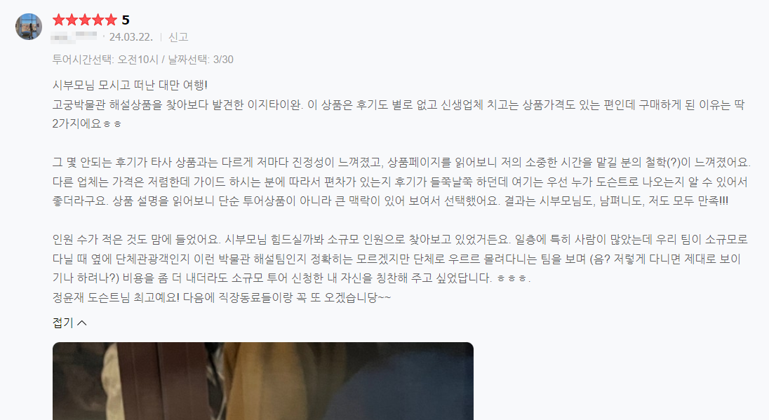 시부모님 모시고 떠난 대만 여행! 고궁박물관 해설상품을 찾아보다 발견한 이지타이완. 이 상품은 후기도 별로 없고 신생업체 치고는 상품가격도 있는 편인데 구매하게 된 이유는 딱 2가지에요ㅎㅎ 그 몇 안되는 후기가 타사 상품과는 다르게 저마다 진정성이 느껴졌고, 상품페이지를 읽어보니 저의 소중한 시간을 맡길 분의 철학(?)이 느껴졌어요.