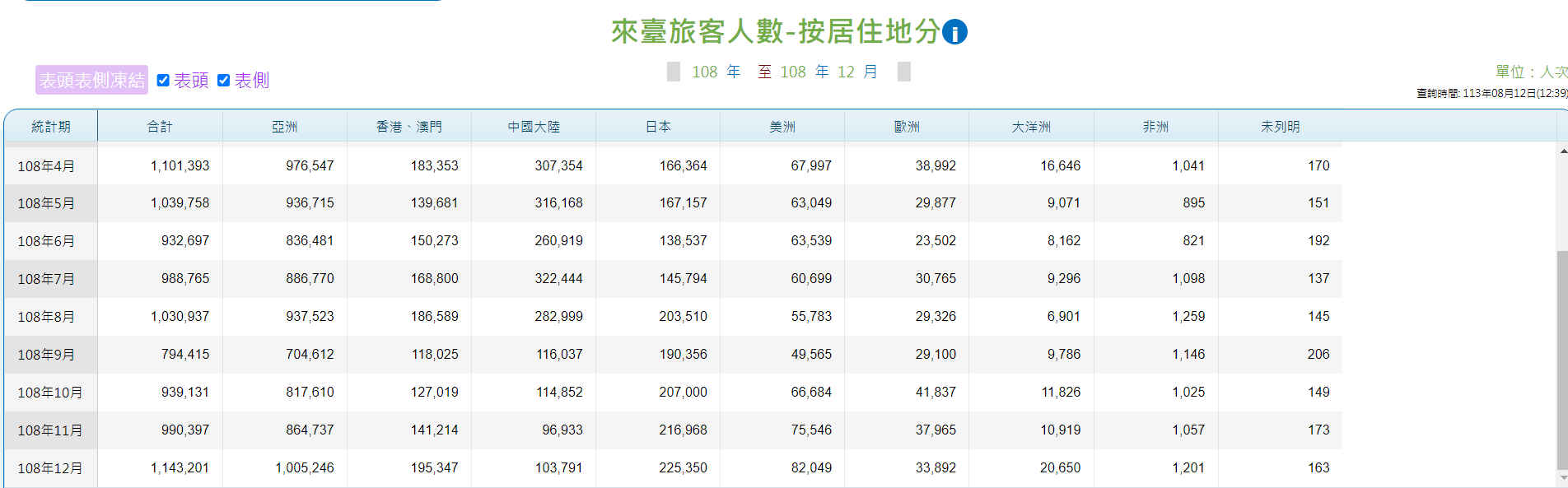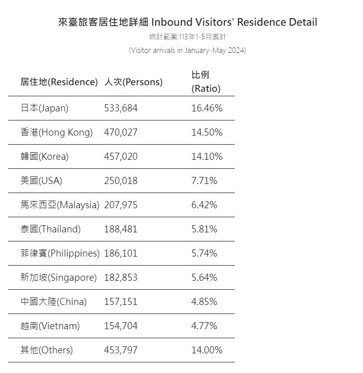 코로나 이전까지 대만으로 입국한 외국인 수를 보면 2019년(민국 108년)이 천 백만 명, 2018년도 비슷한 수치인데요. 코로나가 터지고 2020년에는 입국자 수가 1/10 규모로 확 떨어졌다가, 작년 2023년에는 650만 명 수준으로 회복했고, 올해는 통계청 자료는 없고 관광청 자료로 2024년 1월부터 5월까지의 국가별 비율과 관광객 수를 알 수 있는데요.