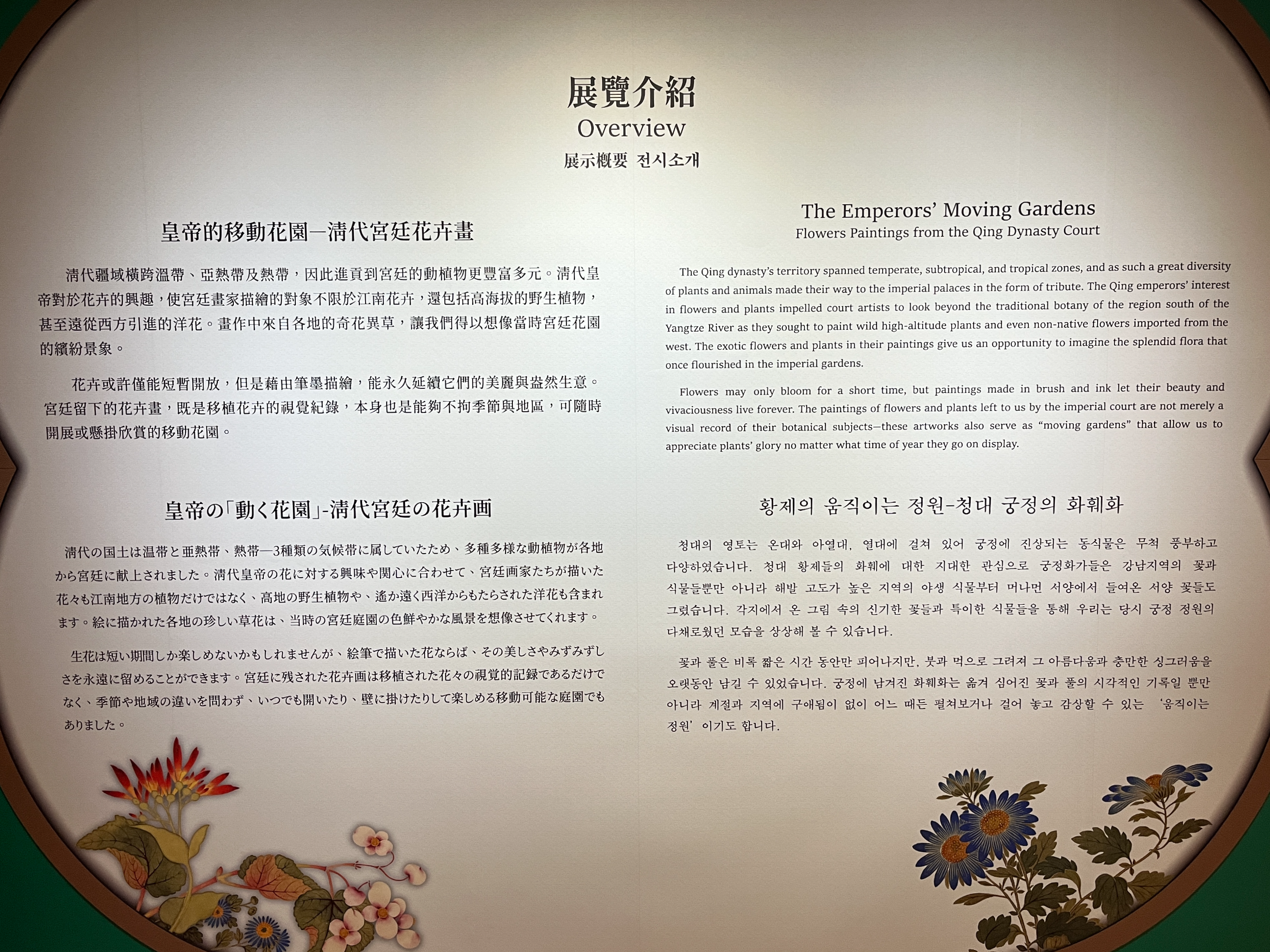 전시설명에 보면 청나라는 온대와 아열대, 열대에 걸쳐 있어 지역마다 서식하는 동물이나 식생이 매우 다양해서, 역대 왕들이 궁정화가들을 시켜 타 지역의 화훼를 그림으로 그리게 하거나, 혹은 실험적으로 남부지역 식물을 궁궐이 소재한 북부로 옮겨와 심어 보기도 했다고 합니다.