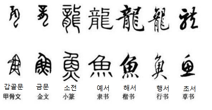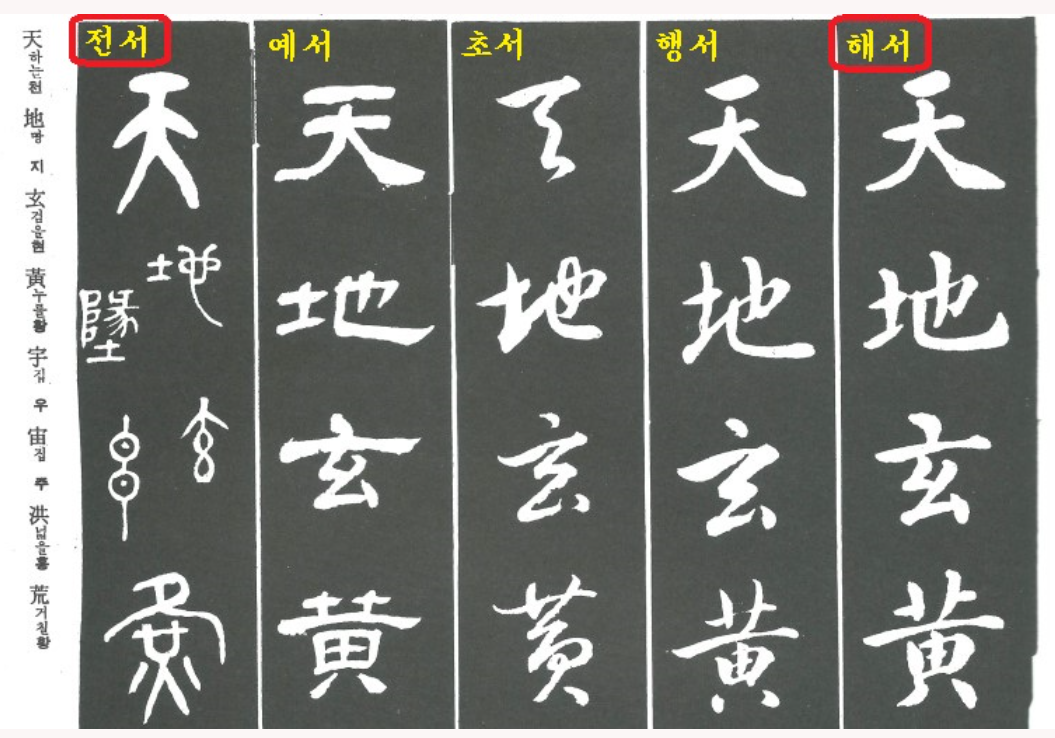 글자를 새길 때 사용된 글자체의 이름을 '전서篆書'체 라고 합니다. 우리가 사용하고 있는 한자의 자형은 크게 다섯 가지로 나눠볼 수가 있는데요. 다음과 같습니다.
