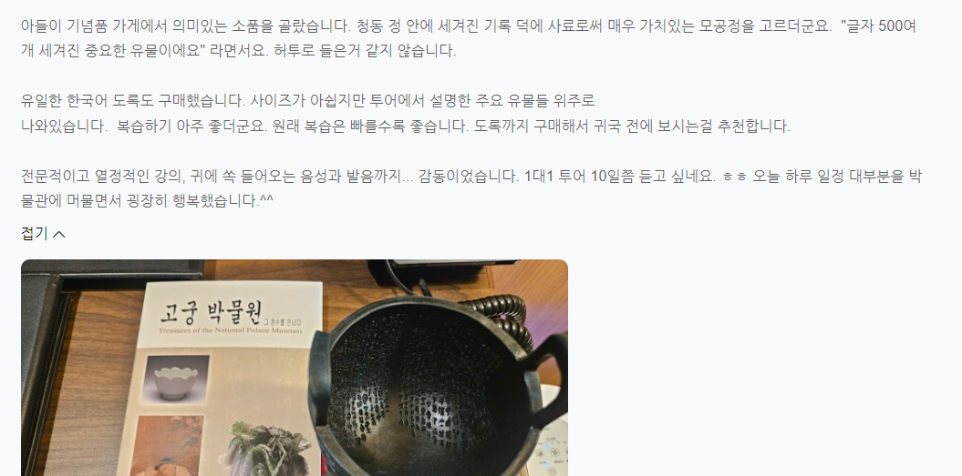 전문적이고 열정적인 강의, 귀에 쏙 들어오는 음성과 발음까지... 감동이었습니다. 1대1 투어 10일쯤 듣고 싶네요. ㅎㅎ 오늘 하루 일정 대부분을 박물관에 머물면서 굉장히 행복했습니다.^^