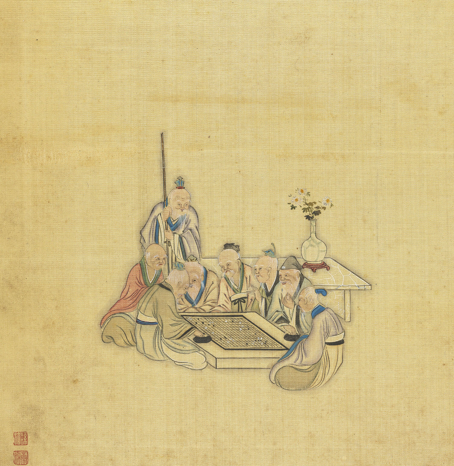 노인의 다수 등장은 이 작품이 단순 인물화가 아닌, 장수와 덕을 기원하는 길상화(吉祥畵) 임을 시사합니다. 배경은 간결하지만, 화면 오른쪽에 보이는 꽃이 꽂힌 도자기 화병은 삶의 여유와 정신적 풍요를 암시합니다.