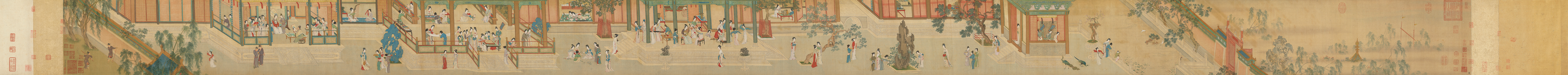 이 작품은 한나라 궁궐의 봄날 아침 풍경을 그렸다는 설정 아래, 실제로는 명대 여성의 궁중 생활을 이상화하여 재현한 것입니다. 그림 속에는 다양한 활동을 하고 있는 여성들이 묘사되어 있으며, 장면마다 세심한 구성이 돋보입니다.